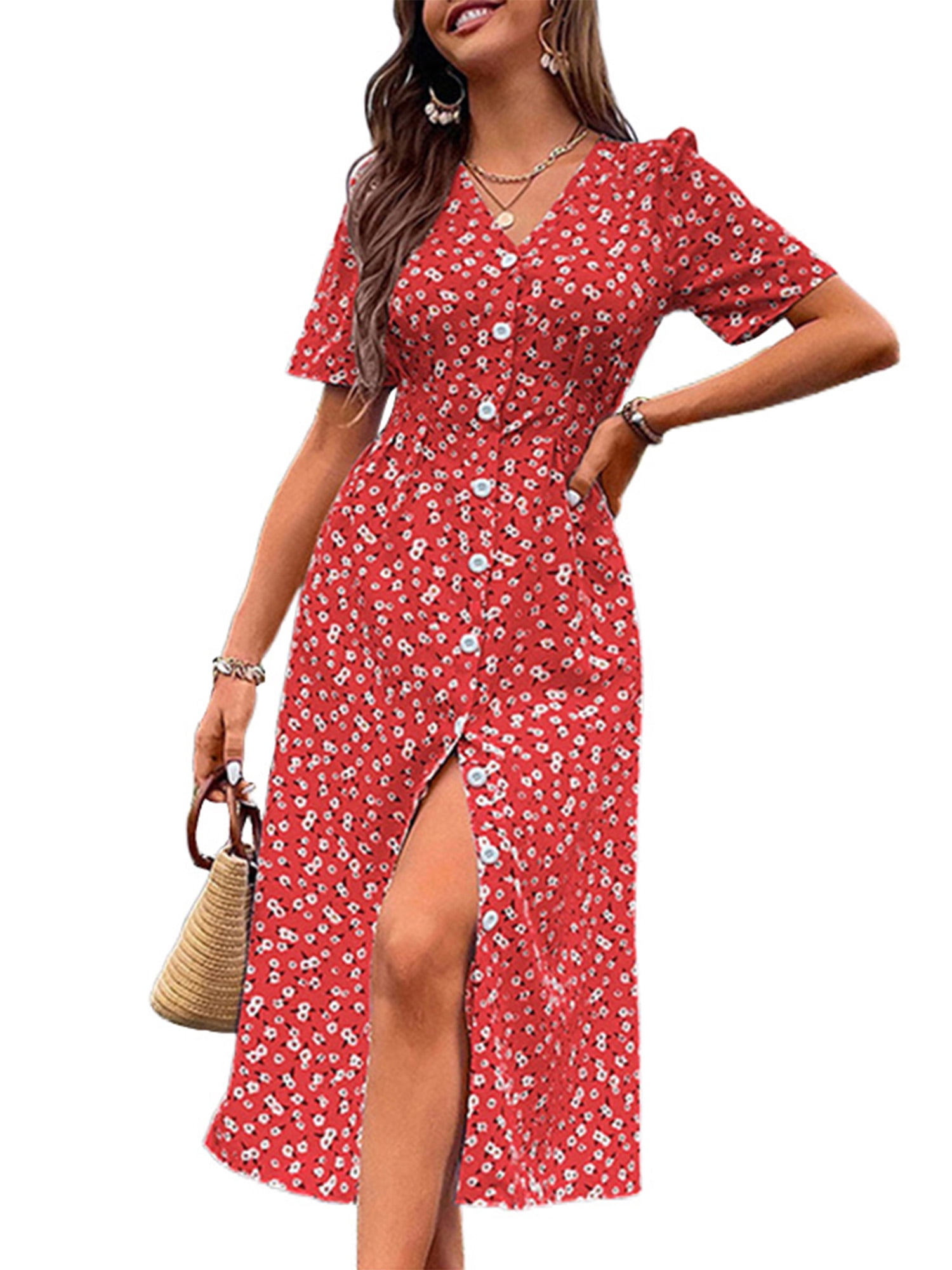 Wrcnote Ladies Midi Dress Floral Printed Swing Dresses High Slit Party Kaftan V Neck Red S Walmart Com